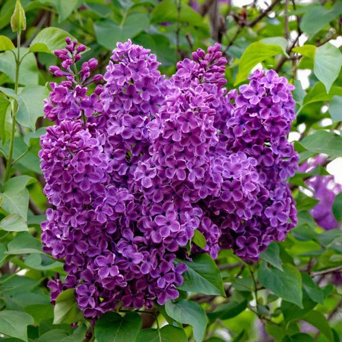 В период раскрытия бутонов сирень «Сумерки» превращается в заметный акцент сада. Пурпурно-фиолетовые бутоны постепенно распускаются в простые цветки диаметром до 2,5 см с насыщенным фиолетово-синим оттенком. Лепестки широкие, слегка заострённые к светлому кончику, что придаёт цветкам глубину и игру цвета. Аромат — сильный, ярко выраженный, с классическими сиреневыми нотами, способный наполнять пространство даже на расстоянии. Соцветия пирамидальной формы, ажурные, длиной 15–20 см, держатся на прочных цветоносах и смотрятся изящно, несмотря на внушительные размеры.