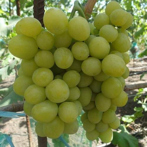 Куст сильнорослый, высота лозы 4,5–5,5 м, ширина кроны — 2–2,5 м. Побеги мощные, цветки обоеполые — опылители не требуются. Срок созревания 105–115 дней, сбор урожая — в августе. Грозди цилиндро‑конические, весом 700–1200 г, отдельные до 1,5 кг. Ягоды крупные, овальные, 10–14 г, косточек 1–2. Мякоть плотная, сочная, умеренно хрустящая, сахаристость 18–20 %, вкус гармоничный.